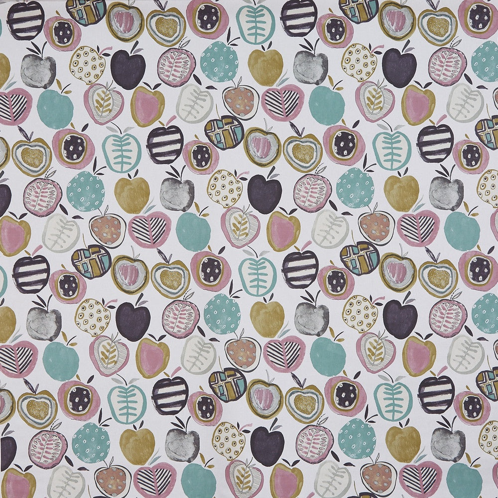 Apples, sliced apples, in lots of patterns and muted ochres and blues on a light background.