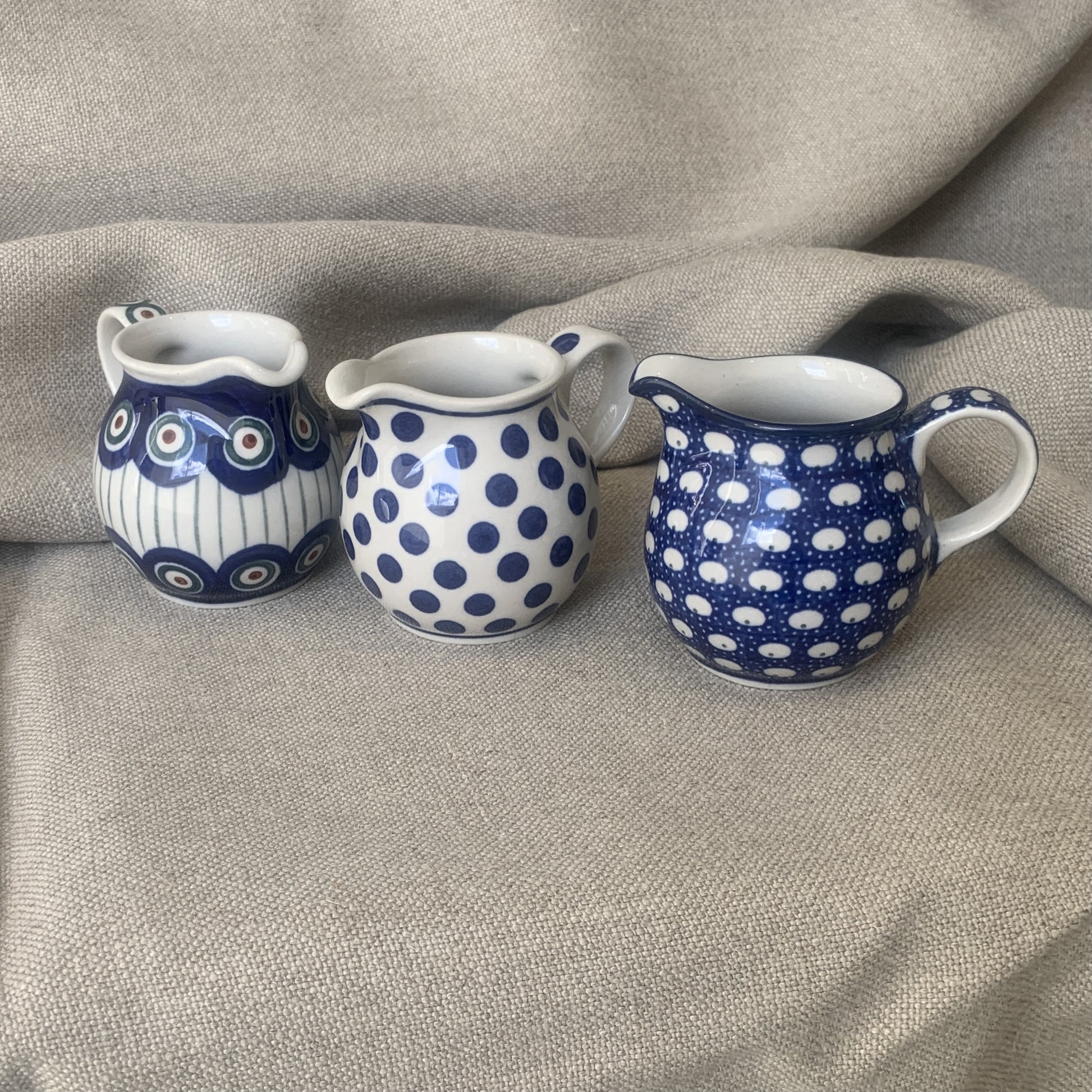 The durable and functional creamy white and blue stoneware pieces are unique and easily identifiable. Ceramics and pottery are a definitive part of the identity of the city of Boleslawiec, Poland.