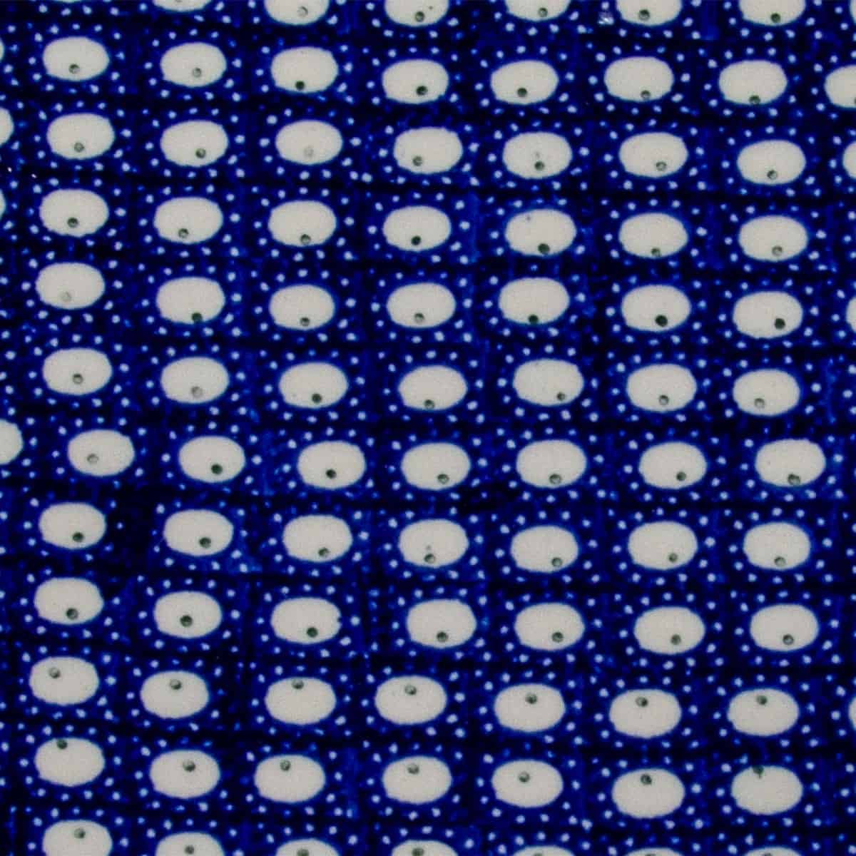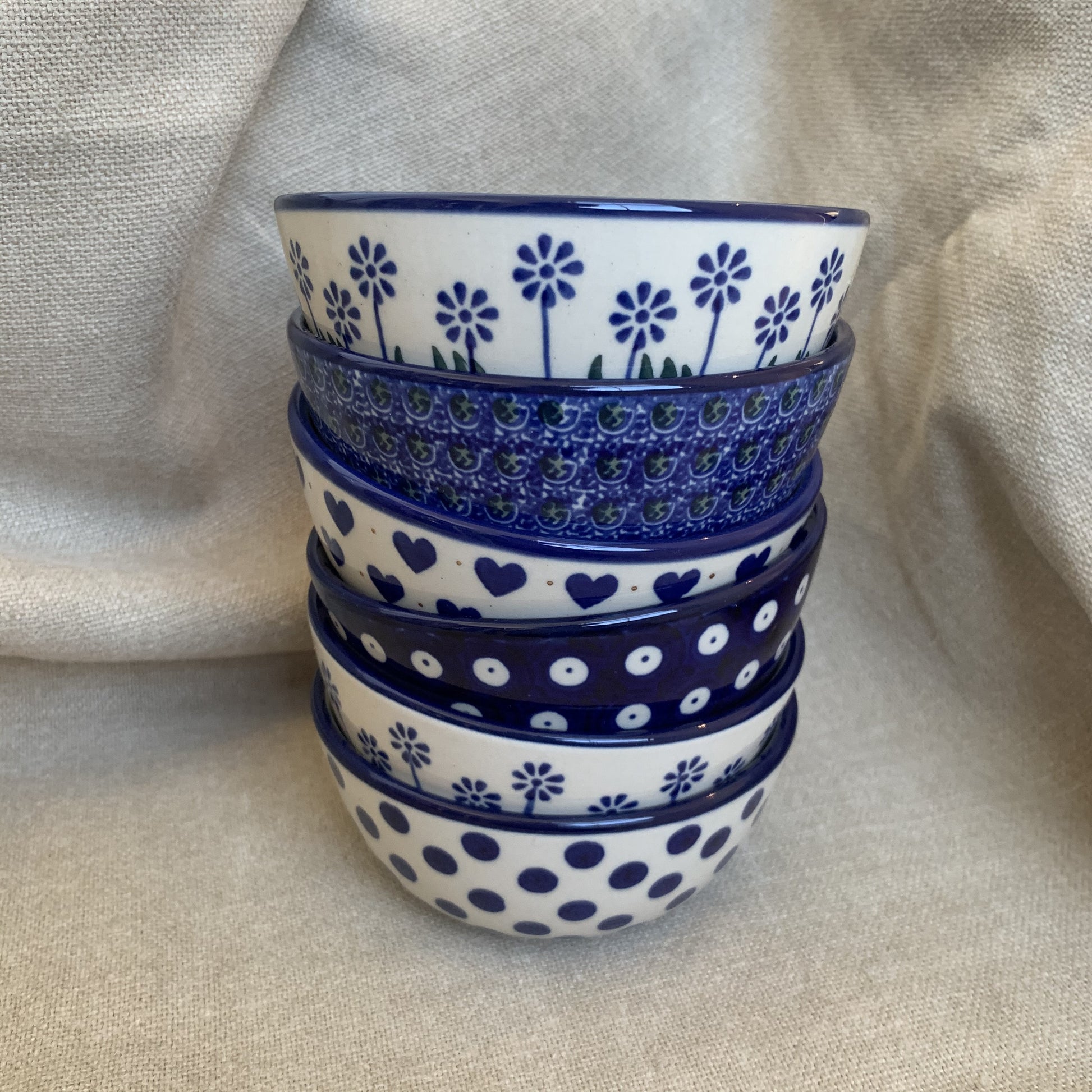 The durable and functional creamy white and blue stoneware pieces are unique and easily identifiable. Ceramics and pottery are a definitive part of the identity of the city of Boleslawiec, Poland.