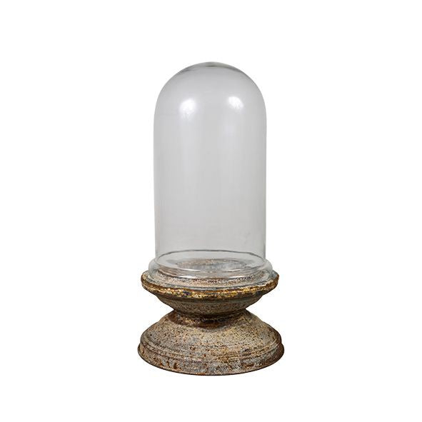 Display treasured curios using this dome and pedestal base. Being finished with aged zinc this décor piece is rustic and sure to add interest in any room of the home.