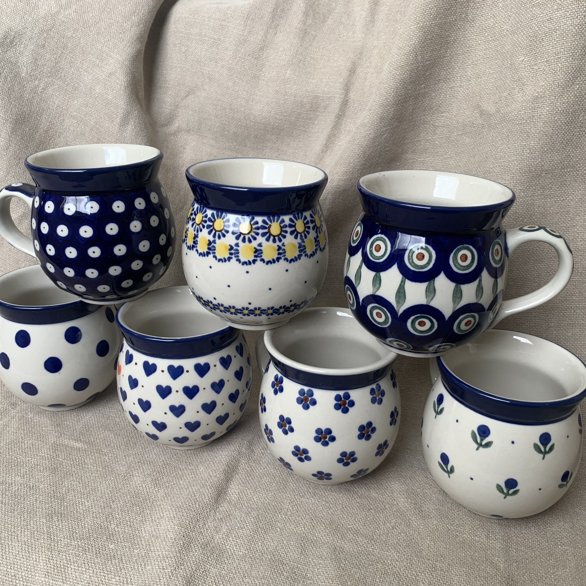 The durable and functional creamy white and blue stoneware pieces are unique and easily identifiable. Ceramics and pottery are a definitive part of the identity of the city of Boleslawiec, Poland.