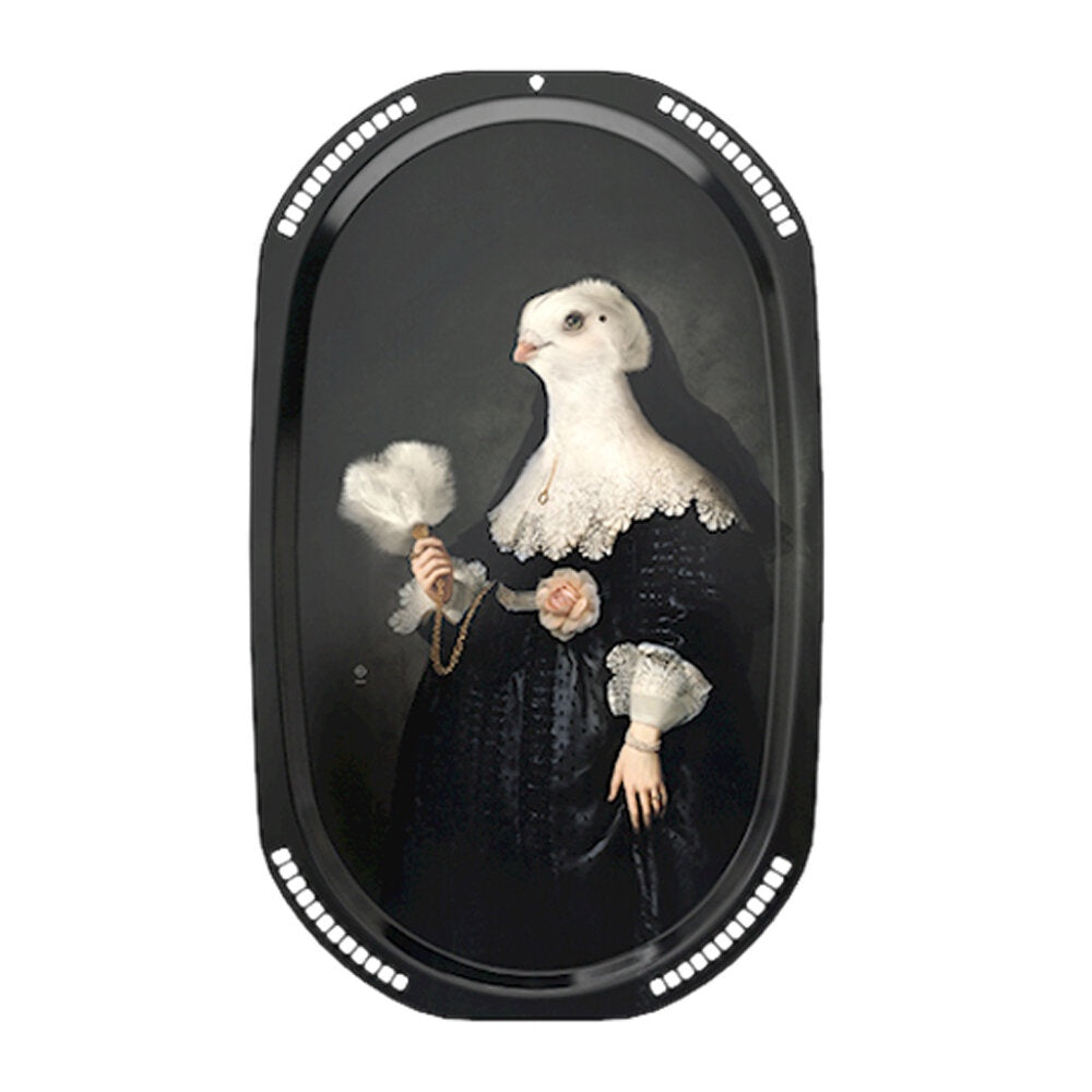 The new ibride duo of trays is inspired by the work of Rembrandt and celebrates the union of Marten and Oopjen Soolmans. Rachel Convers re-enacts the scene of their singular nuptial parade where the lovers, with their immaculate plumage of newly-weds invent a new language of love. Adorned with a delicate rose and a fan of white feathers, Oopjen seems to yearn for the butterflies released by Marten that incarnate lucky charm messengers...