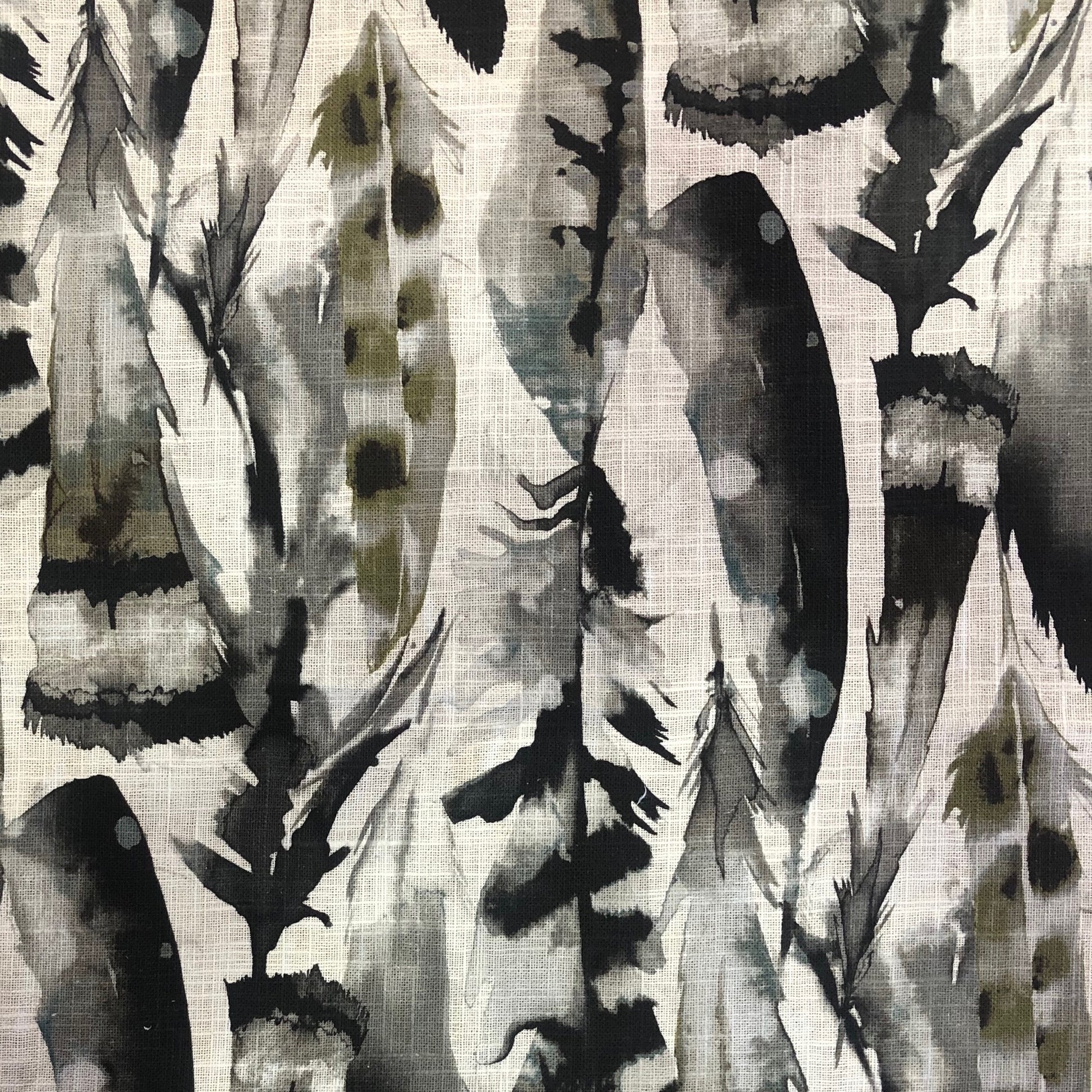 A stunning fabric featuring feathers in charcoal and grey, with a hint of chartreuse and seaglass on a white background. Suitable for curtains, blinds and soft furnishings.