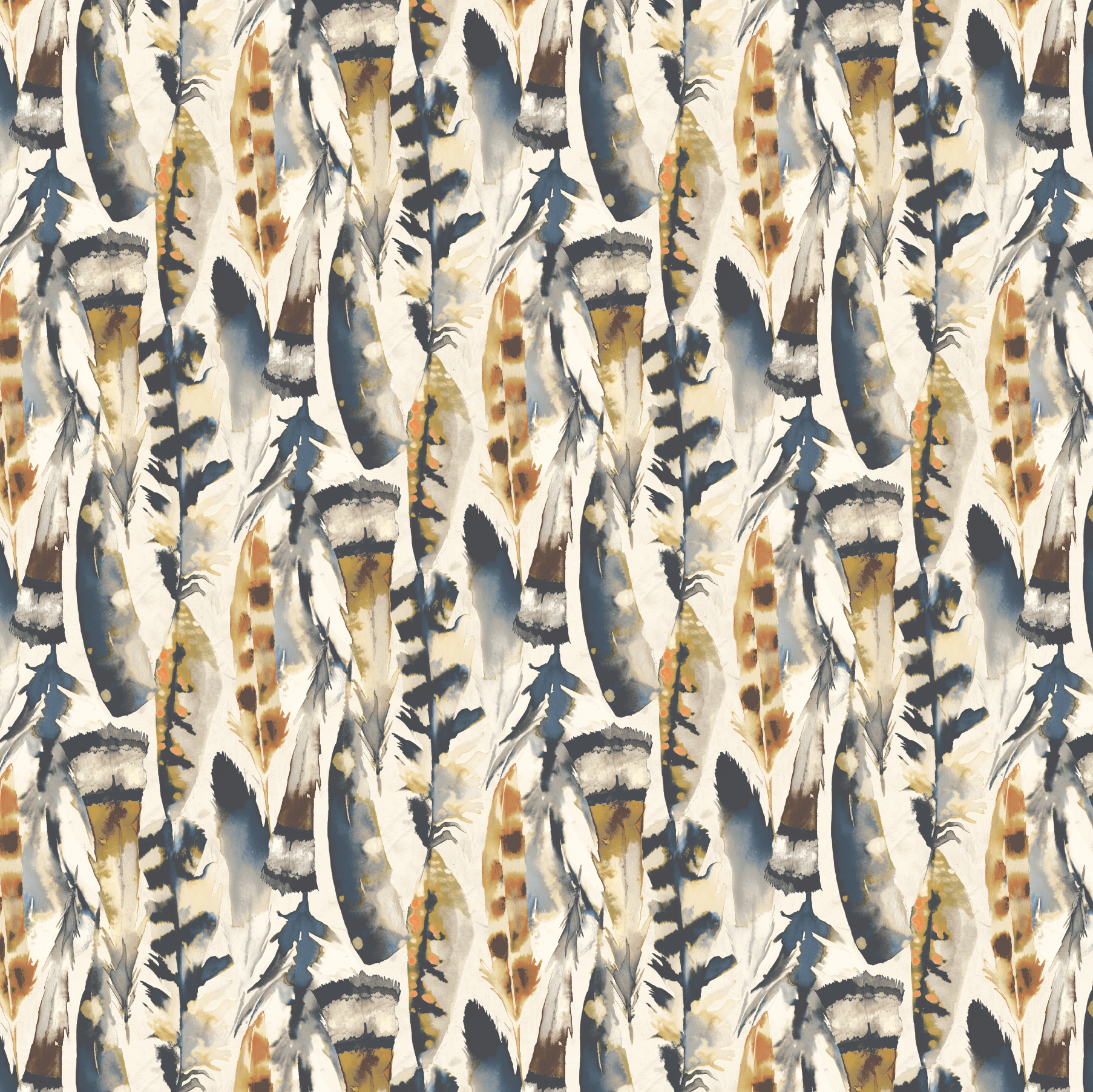 A stunning fabric featuring feathers in indigo and navy, with a hint of mustard and orange on an off white background. Suitable for curtains, blinds and soft furnishings.