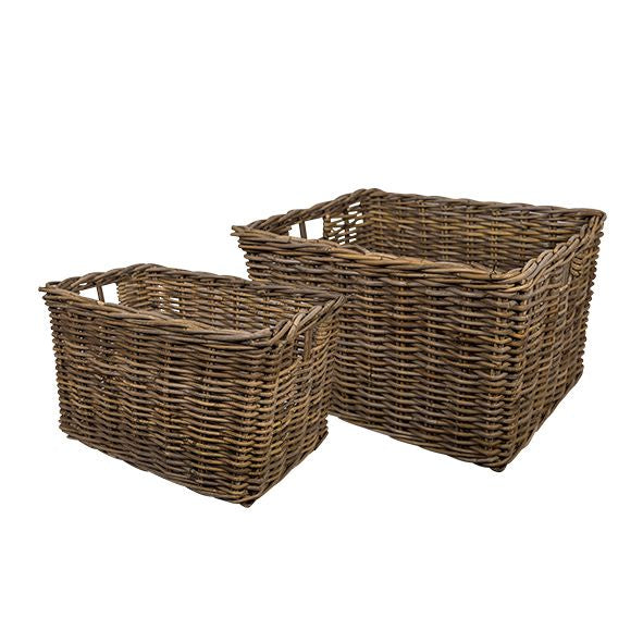 Provincial styled rectangle woven baskets with cut out handles in light grey to be used for easy storage.