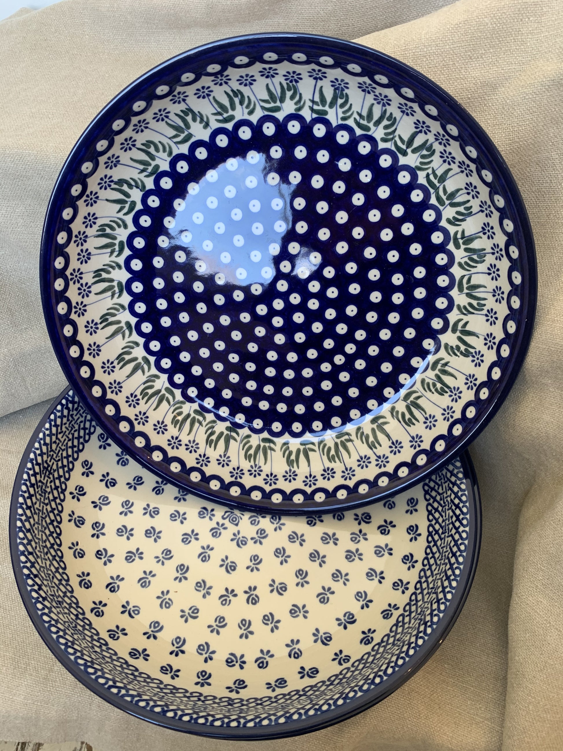 The durable and functional creamy white and blue stoneware pieces are unique and easily identifiable. Ceramics and pottery are a definitive part of the identity of the city of Boleslawiec, Poland.