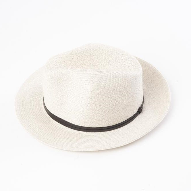Borsalino style, plaited paper hat with leather strap.