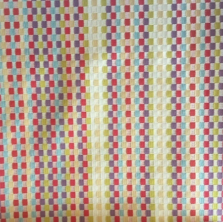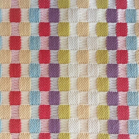 A multi-coloured geometric, woven jacquard fabric. Colours include red, yellow, blue and white.