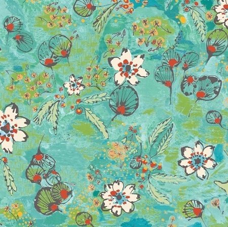 A contemporary floral in colours of red, green and blues on a turquoise background. 55% linen/45% viscose. Suitable for curtains, blinds and soft furnishings.