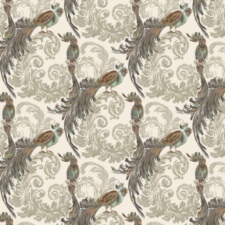 Teal, grey and gold parrots on scrolls and a white background. 55% linen/45% viscose. Suitable for curtains, blinds and soft furnishings.