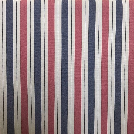 A heavy cotton stripe with red, navy and beige. Suitable for curtains, blinds and soft furnishings.