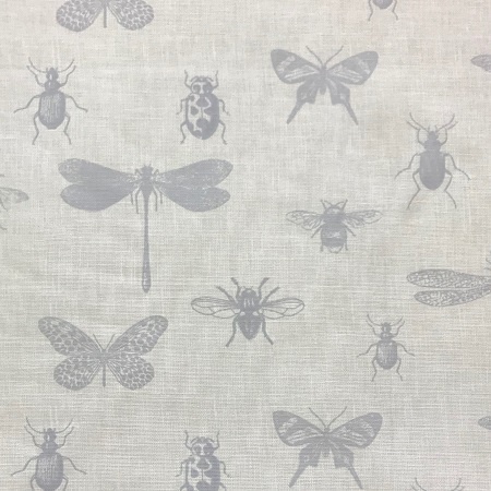 An all over pattern featuring beetles, bees, bugs and butterflies in grey on a pale background. Suitable for curtains, blinds and soft furnishings.