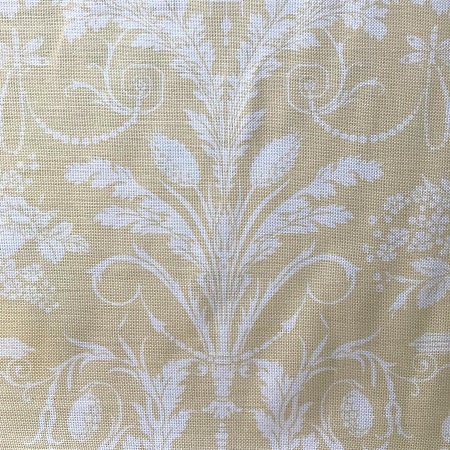 A heavyweight linen with a white all over classical pattern on a lemon background. Suitable for curtains, blinds and soft furnishings.