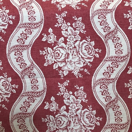 A linen with a cream floral pattern on a raspberry red background. Suitable for curtains, blinds and soft furnishings.
