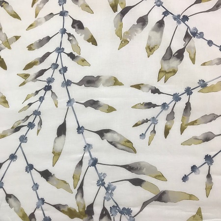 A watercoloured leaf pattern with a white background on a fine fabric.