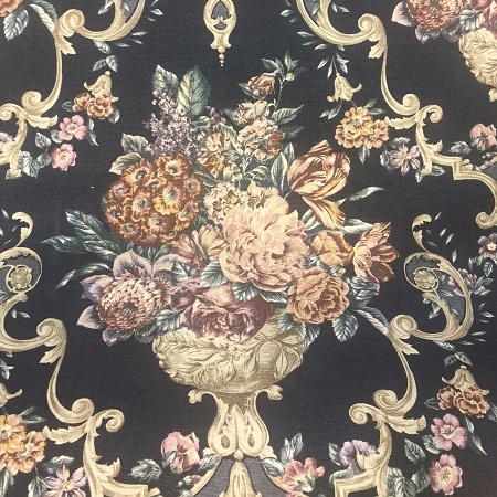 A stunning floral featuring urns of floral blooms in muted tones of gold, green, red, purple and pink, on a black background. Suitable for curtains, blinds and soft furnishings.