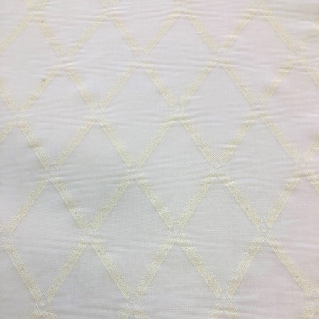 A sheer white voile with a white printed diamond trellis pattern. Suitable for curtains.