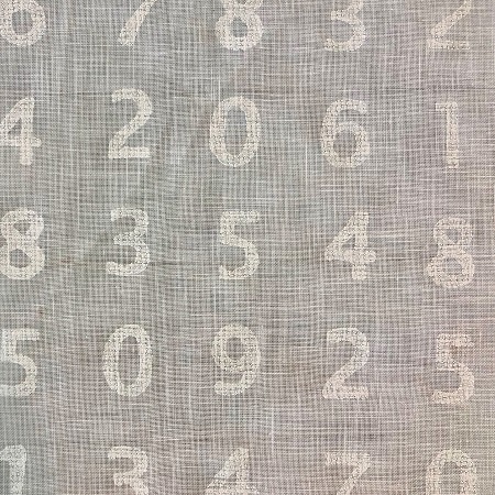A sheer white voile with a white printed number pattern. Suitable for curtains.