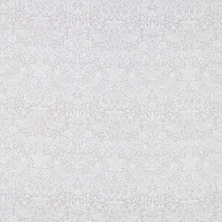 A classic William Morris pattern of birds and strawberries amongst the flora and fauna. Printed in white on a pale grey linen/cotton blend.