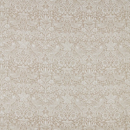 A classic William Morris pattern of birds and strawberries amongst the flora and fauna. Printed in white on a pale taupe linen/cotton blend.