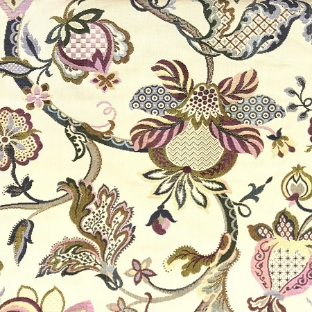 A traditional Jacobean style tapestry in a medium weight with a light beige background and flowers in cranberry, gold, teal and green. Not as dark as the Ibiza Tapestry Beige.