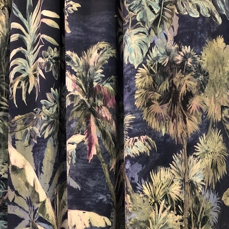 A stunning light weight velvet with an all over palm pattern in greens and blues on a royal navy background. Suitable for curtains, blinds and soft furnishings.